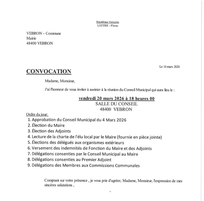 Nous informons l’ensemble des habitants qu’à compter du lundi 16 février 2026, la Mairie située place de la Mairie à Vébron rouvre officiellement ses portes au public.